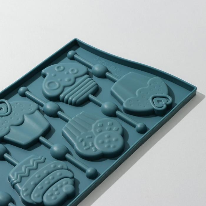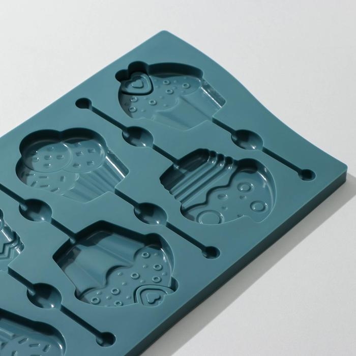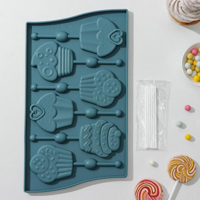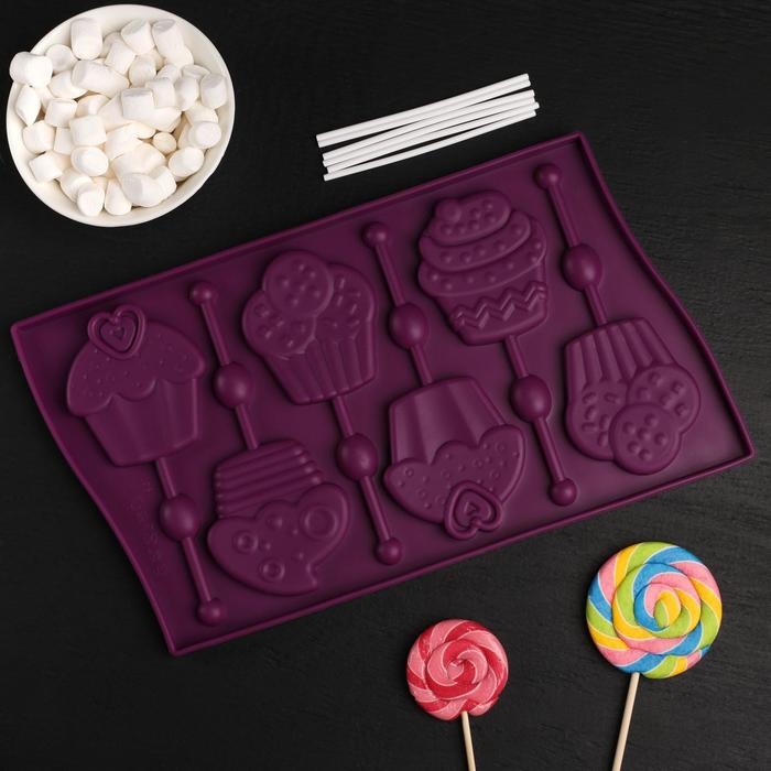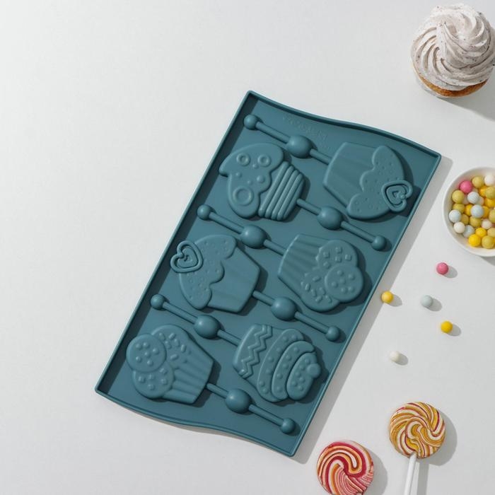 Форма для леденцов Доляна «Капкейк», силикон, 27,5×16,5 см, 6 ячеек (6×7 см), с палочками, цвет МИКС