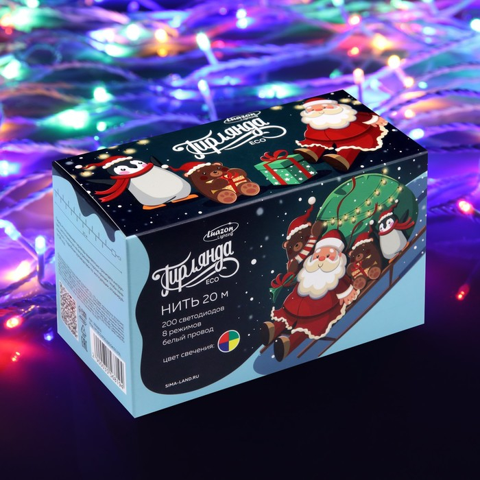 Гирлянда «Нить» 20 м, IP20, белая нить, 200 LED, свечение мульти, 8 режимов, 220 В