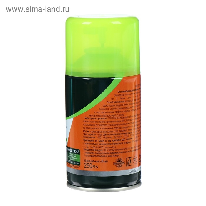 Состав: парфюмерная композиция 5%, лимонен, линалоол, спирт денатурированный 30%, пропан, бутан, изобутан 30%.