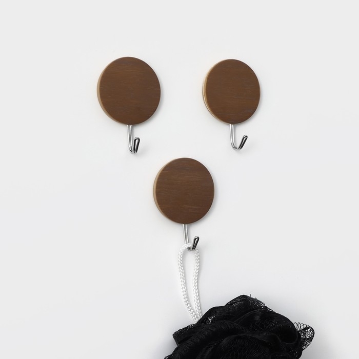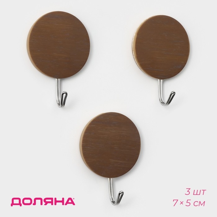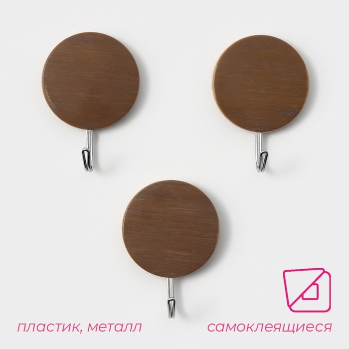 Крючки самоклеящиеся Доляна «Деревянные круги», 3 шт, цвет коричневый