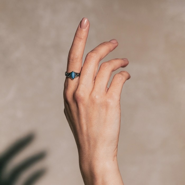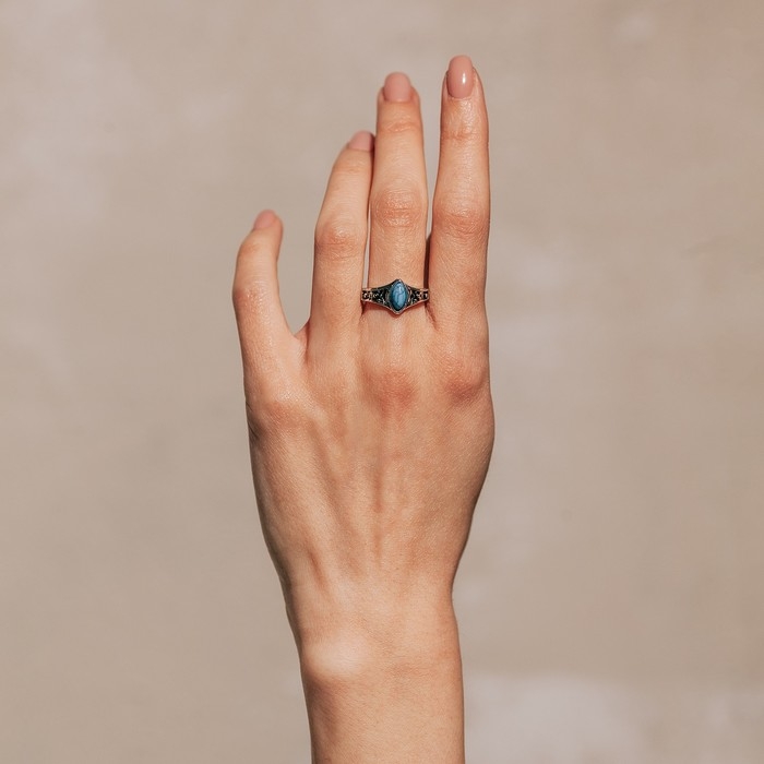Кольцо «Бирюзовый мир» овал, цвет чёрно-голубой в чернёном серебре, безразмерное