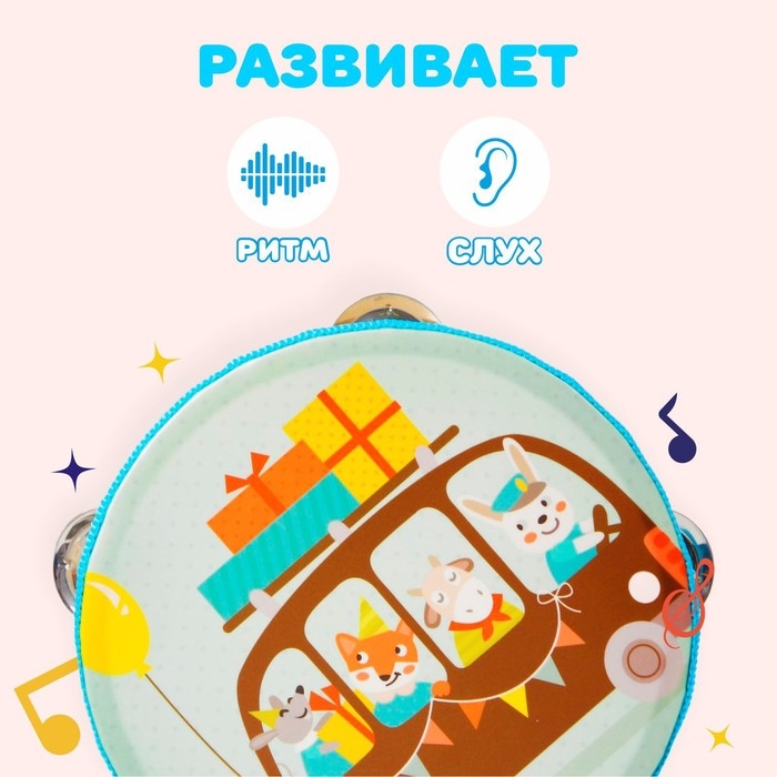 Яркий бубен с улыбчивыми персонажами — это первый шаг малыша в мире музыки. Он позволит ребёнку окунуться в процесс создания мелодий, нужно только встряхнуть игрушку.