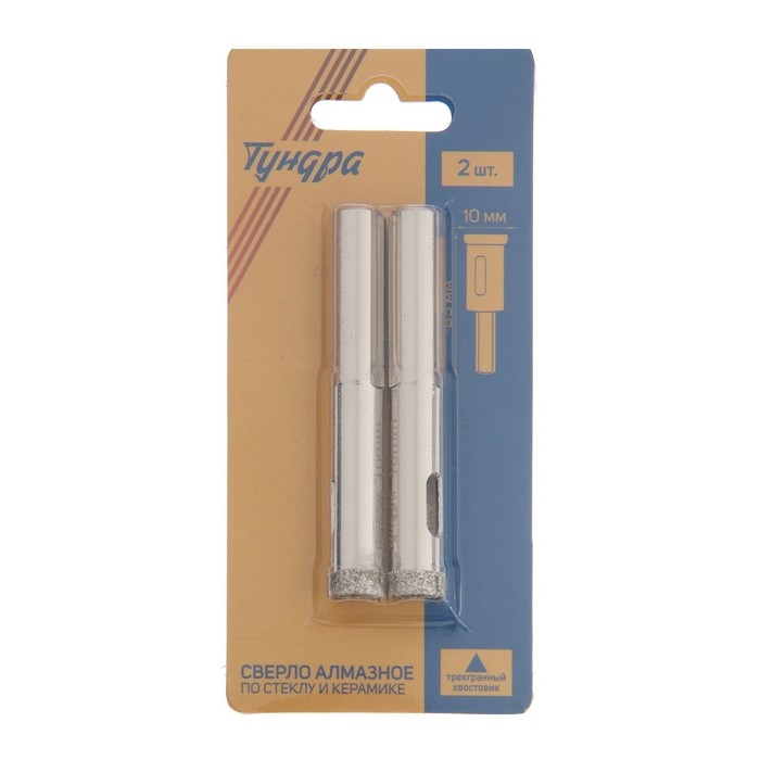 Сверло алмазное по стеклу и керамике ТУНДРА, трехгранный хвостовик, 10 х 65 мм, 2 шт.