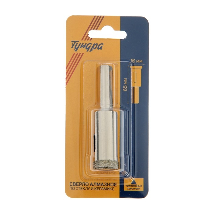Сверло алмазное по стеклу и керамике ТУНДРА, трехгранный хвостовик, 16 х 65 мм