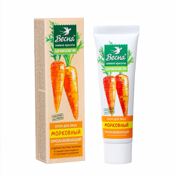 Крем для лица Весна Морковный омолаживающий, наполняет кожу жизненной энергией, устраняет сухость и шелушение, повышают гладкость кожи. Крем подходит для ежедневного применения. Входящие в состав крема для лица экстракт сока Моркови, Б-каротин и специально подобранный комплекс смягчают и тонизируют кожу лица, способствуют поддержанию в норме воднолипидного баланса. Цвет лица улучшается, снижается покраснение кожи. В состав крема для лица омолаживающий входят компоненты: экстракт моркови, витамин Е, оливковое масло, гидрованс, косметическая формула крахмала. Крем для лица призван питать, увлажнять и матировать кожу лица. Крем для лица омолаживающий белого цвета, с легким растительным ароматом, довольно густой, нежный, нежирный. Крем для лица легко наносится, практически мгновенно впитывается, не липнет, не скатывается. Крем подходит для любого типа кожи.