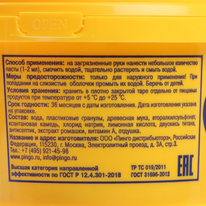 Паста для очистки рук PINGO с антисептическими свойствами, 200 мл