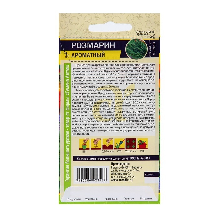 Ценное пряно-ароматическое и лекарственное растение. Сорт среднеспелый (начало хозяйственно годности наступает на второй год жизни, через 75-80 дней от начала весеннего отрастания). Урожайность зеленой массы 0,5 кг/кв.м. В народной медицине применяют как вяжущее, тонизирующее, болеутоляющее средство, укрепляет нервы, расширяет сосуды. Листья и молодые побеги используют в кулинарии в свежем и сушеном виде, как приправа к мясу, рыбе, овощным блюдам. Теплолюбивое, светолюбивое растение. Подходит для комнатного выращивания. Предпочитает легкие, хорошо дренированные почвы. Не выносит кислые почвы и переувлажнение. Посев семян на рассаду проводят в конце февраля – начале марта. Перед посевом семена выдерживают в теплой воде 18-20 часов. Когда семена набухнут, их высевают в увлажненный песок либо в торфяные таблетки на глубину 0,3–0,4 см и накрывают пленкой. Когда высота сеянцев достигнет 7-8 см, их высаживают в открытый грунт, соблюдая посадочный интервал 20х50 см. Высаживать в открытый грунт следует, когда минует угроза возвратных заморозков, выбирая хорошо освещенные, защищенные от ветра участки. Зимой кусты розмарина укрывают, либо заранее выкапывают, пересаживают в горшки и заносят на зиму в помещение, не допуская резких перепадов температуры для поддержания высокой декоративности.