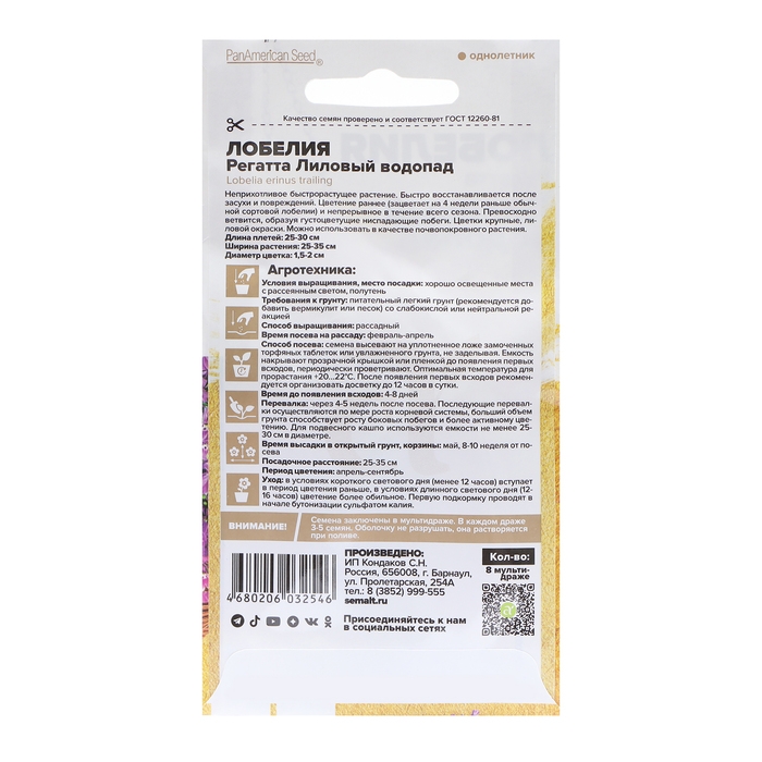 Семена цветов Лобелия Регатта "Лиловый Водопад" ампельная, О, цп, 8 шт.