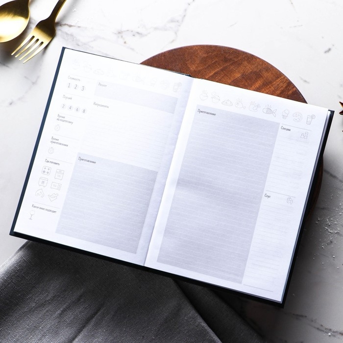 Ежедневник для записи рецептов - Отличный помощник на кухне, он всегда будет под рукой, в отличие от любых электронных аналогов. Записи позволят не забыть про удачный рецепт, который снова захотите повторить. Для удобства использования, вы можете отмечать сложность, время приготовления, где готовится и количество порций, для каждого рецепта, а так же записывать весь процесс приготовления. Благодаря твердой обложке он прослужит долгие годы. А универсальный формат, не займет много места на вашей кухне.