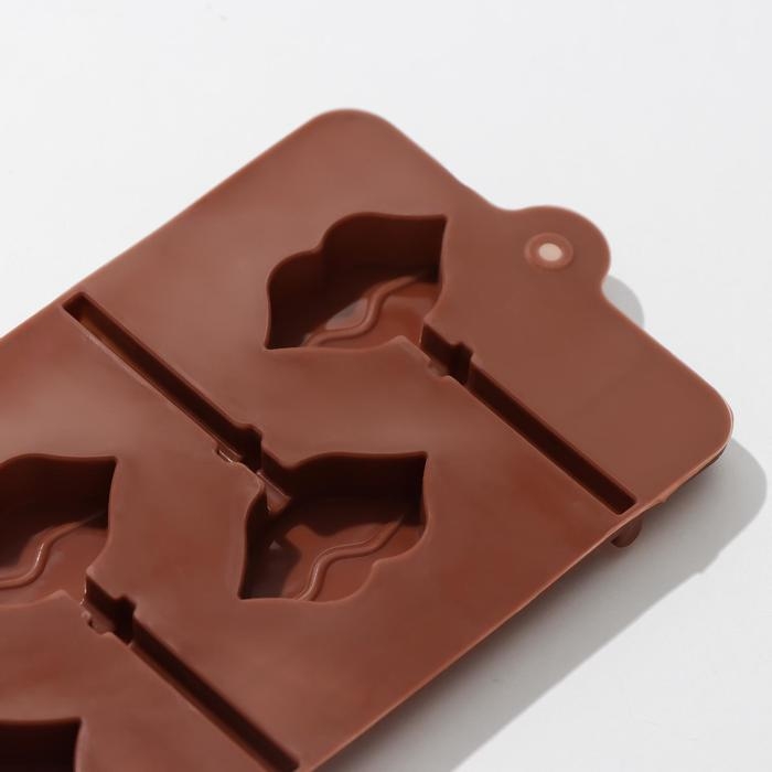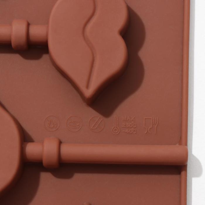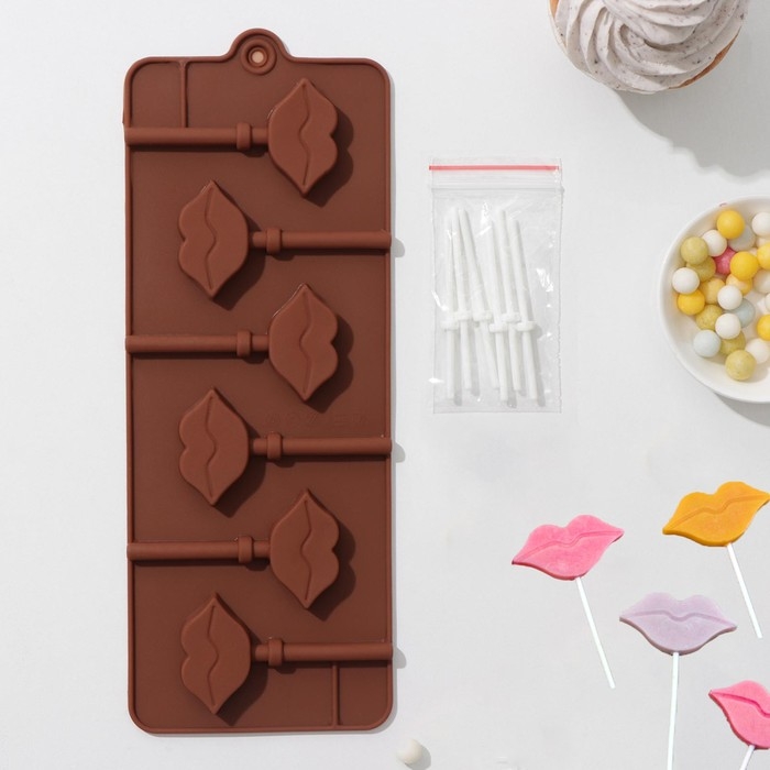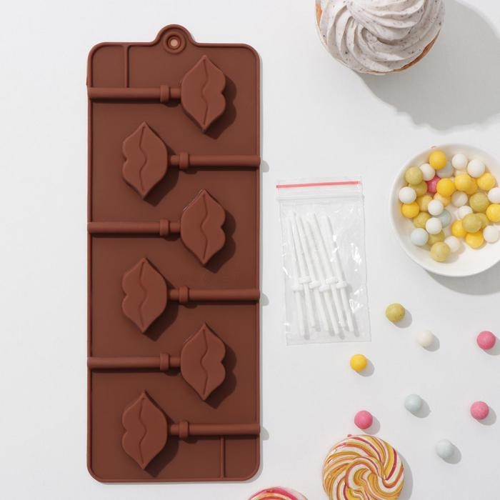 Форма для леденцов Доляна «Поцелуй», силикон, 24×9,4×1,5 см, 6 ячеек (4×2,4 см), с палочками, цвет коричневый