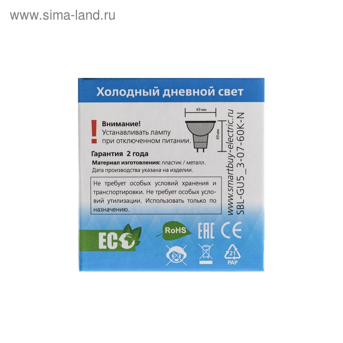 Лампа cветодиодная Smartbuy, GU5.3, 7 Вт, 6000 К, холодный белый свет