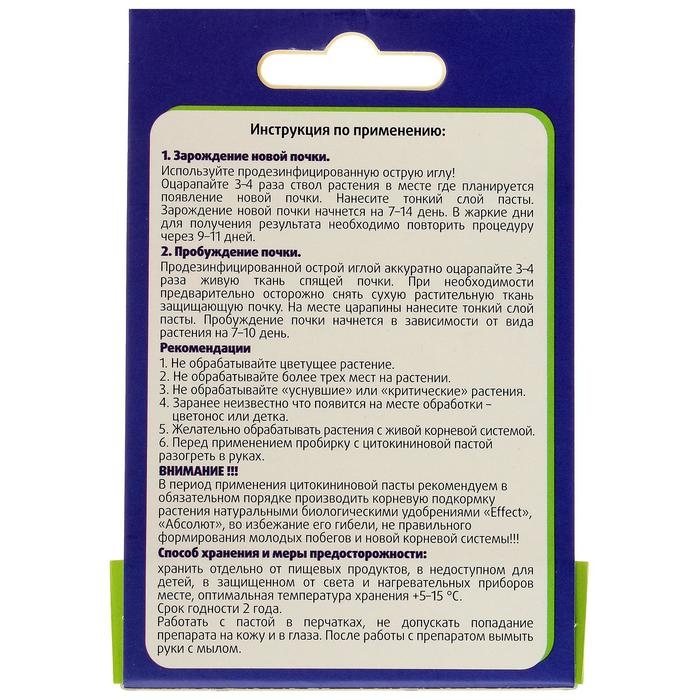 Паста цитокининовая подходит всем видам комнатных и садовых растений. Стимулирует пробуждение спящих почек и образование новых побегов. Способствует прорастанию цветоносов и активации роста боковых побегов за 7–14 дней.