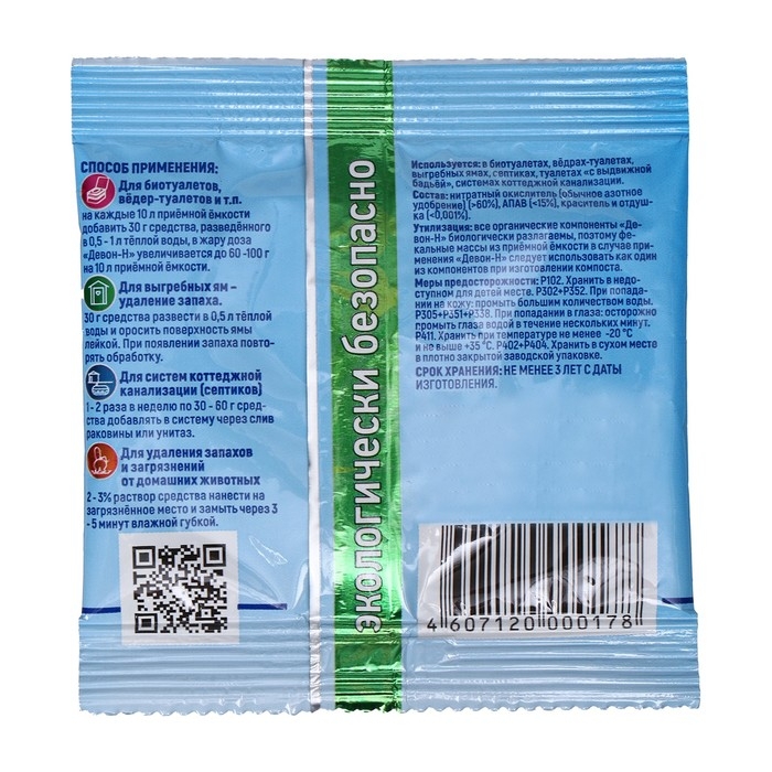 Средство «Девон-Н» в виде порошка устраняет запахи (от животных, фекальные, рвотные и т. д.). Одноразовый пакетик удобно взять с собой на дачу, даже если вы едете на общественном транспорте: он не займёт много места и не утяжелит сумку.