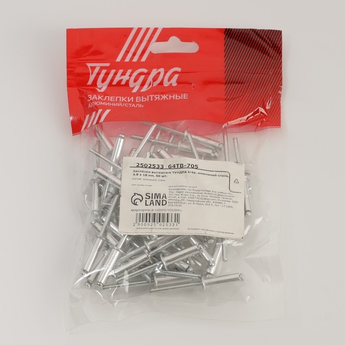 Заклёпки ТУНДРА krep – это крепежные элементы, которые используются для быстрого и надежного соединения различных деталей и конструкций. Они представляют собой металлические стержни с головкой на одном конце и специальным элементом для вытягивания на другом.