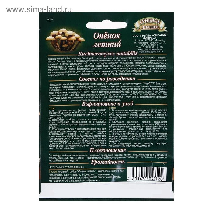 Плодоношение: Первый урожай при выращивании на мягкой древесине (береза, тополь, ива, липа) через 4 месяцев, на твердой (бук, дуб, ясень, клен) – через 9 месяцев. Плодоношение волнами до 5 лет на мягкой древесине, до 8 лет на твердой. Урожайность: От 20 до 50% от веса бревна. Состав: Мицелий грибов "Опенок летний" на древесных палочках. Невскрытый пакет хранить в сухом прохладном месте, возможно в холодильнике при положительной температуре.