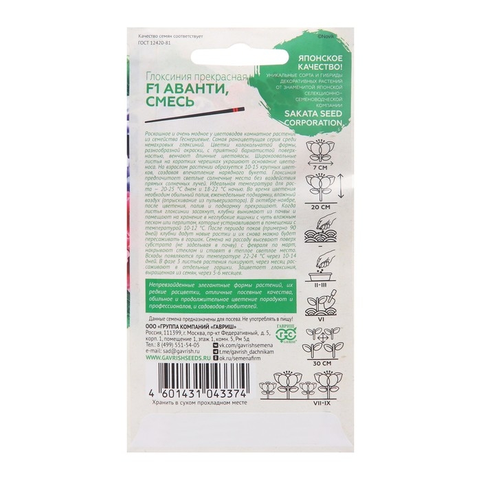 Семена комнатных цветов Глоксиния Аванти "Смесь", F1, 4 шт.