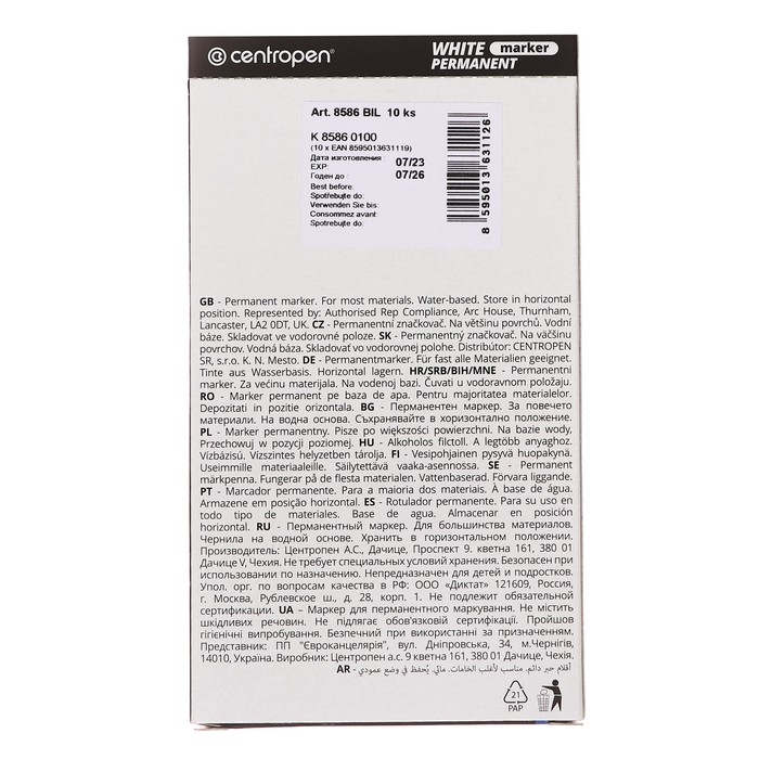 Маркер перманентный 5.0 мм Centropen 8586, линия 2,5 мм, цвет белый