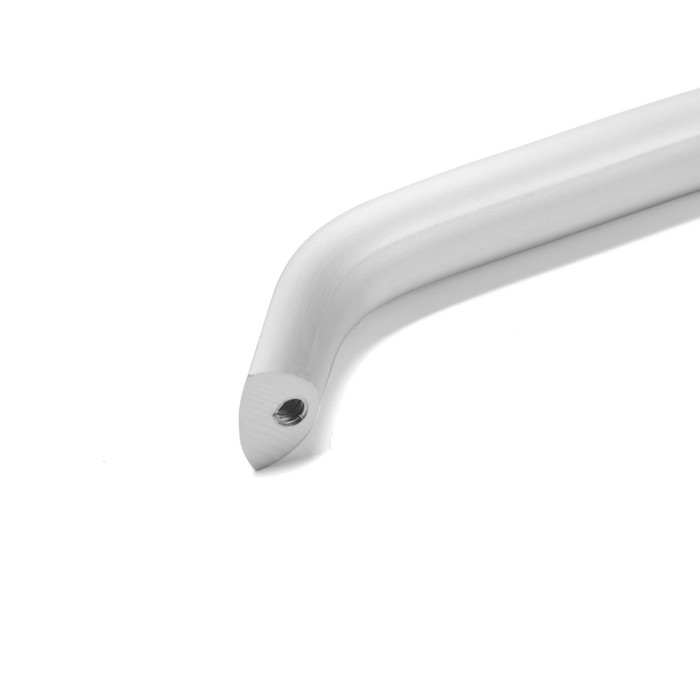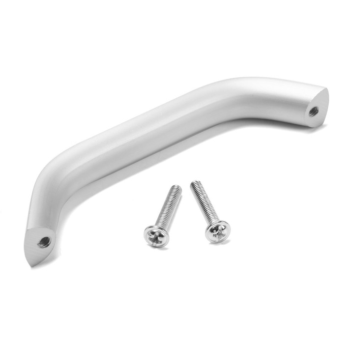 Данная дверная ручка представляет собой неподвижную скобу, которая крепится к поверхности мебели с помощью двух винтов. Модель выполнена из прочного алюминия и имеет матовый серебристый цвет.