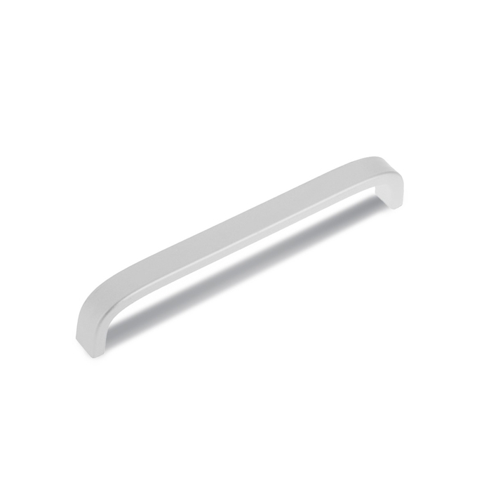 Данная дверная ручка представляет собой неподвижную скобу, которая крепится к поверхности мебели с помощью двух винтов. Модель выполнена из прочного алюминия и имеет матовый серебристый цвет.