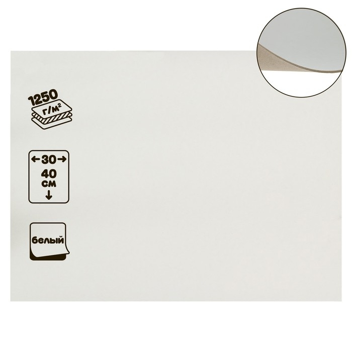 Картон переплётный (обложечный) 2.0 мм, 30 х 40 см, 1250 г/м2, белый