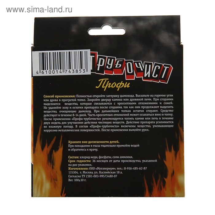 Очиститель от копоти и сажи «Трубочист профи» состоит из смеси специальных солей. Компоненты препарата в процессе горения дров действуют как катализаторы, выделяющие газы, которые вступают в реакцию со смолистыми отложениями и разрушают их структуру, улучшает тягу, повышает теплоотдачу топлива. Вследствие этого испаряется влага – основной компонент, обуславливающий твердость смолистого налета. Остаются лишь хрупкие остатки смолы, которые осыпаются, термически расщепляются и сгорают. Снижается угроза воспламенения сажи.