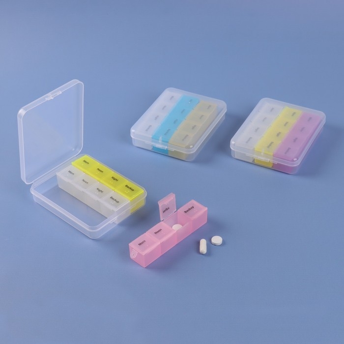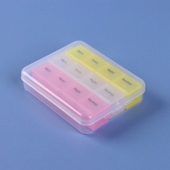 Таблетница-органайзер «Неделька», английские буквы, утро/день/вечер/ночь, 10 × 7,5 × 4 см, 7 контейнеров по 4 секции, разноцветный
