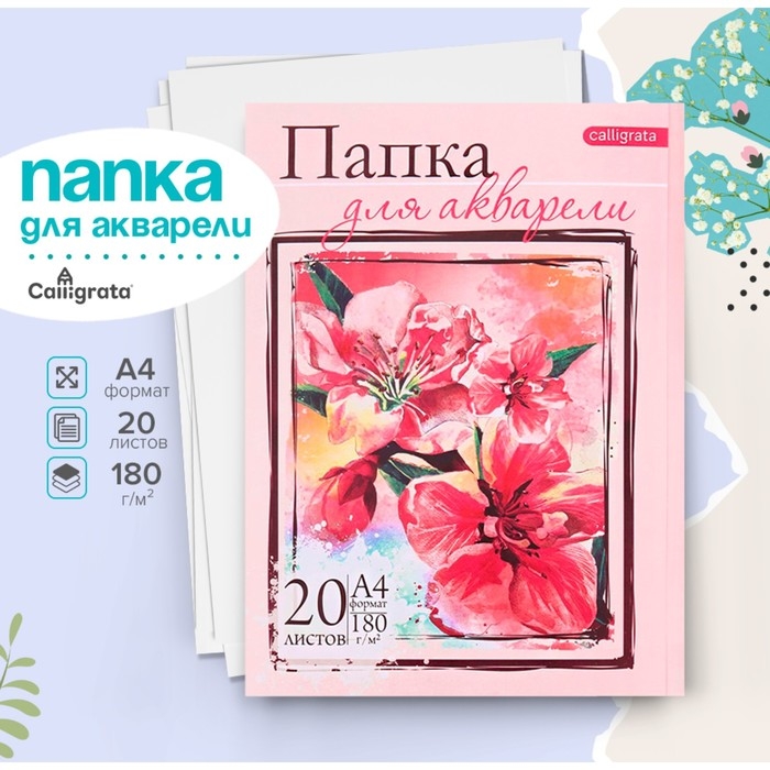 Папка для акварели А4, 20 листов "Цветы", блок 180 г/м