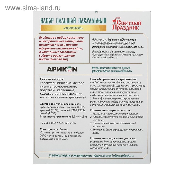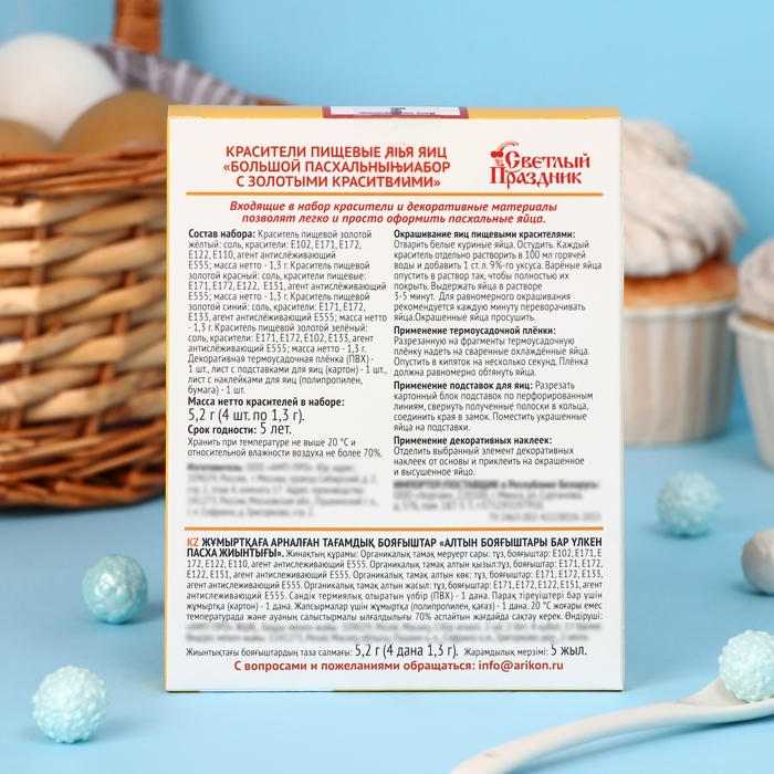 Краситель пищевой золотой желтый: соль, красители пищевые: Е102, Е171, Е172, Е122, Е110, агент антислёживающий Е555; масса нетто - 1, 25 г. Краситель пищевой золотой красный: соль, красители пищевые: Е171, Е172, Е122, Е151, агент антислёживающий Е555; масса нетто - 1, 25 г. Краситель пищевой золотой синий: соль, красители пищевые: Е171, Е172, Е133, агент антислёживающий Е555; масса нетто - 1, 25 г.Краситель пищевой золотой зеленый: соль, красители пищевые: Е171, Е172, Е102, Е133, агент антислёживающий Е555; масса нетто - 1, 25 г. Лист подставок для яиц, лист наклеек золотое сияние.