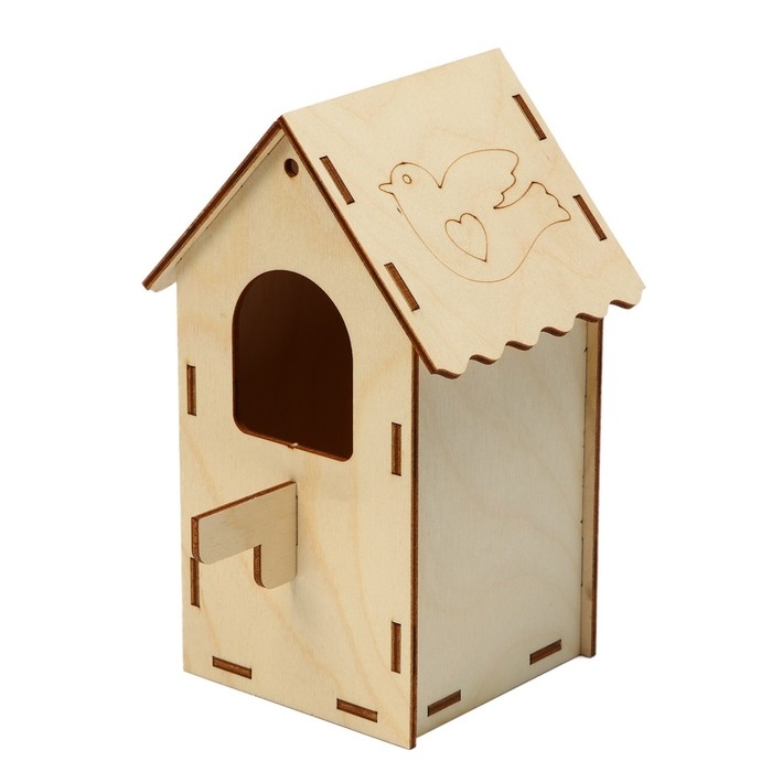Чтобы собрать кормушку, аккуратно соедините фанерные детали, вставляя их в пазы. Используйте клей для лучшей фиксации. При желании модель можно раскрасить или задекорировать.