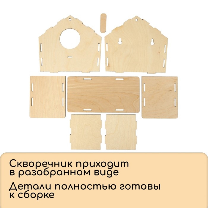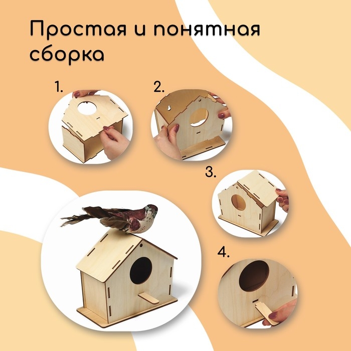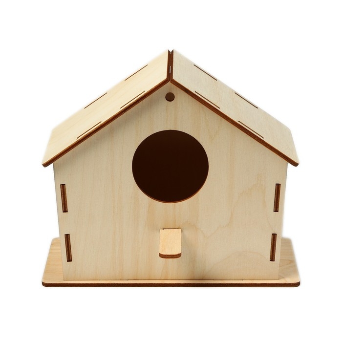 Чтобы собрать кормушку, аккуратно соедините фанерные детали, вставляя их в пазы. Используйте клей для лучшей фиксации. При желании модель можно раскрасить или задекорировать.