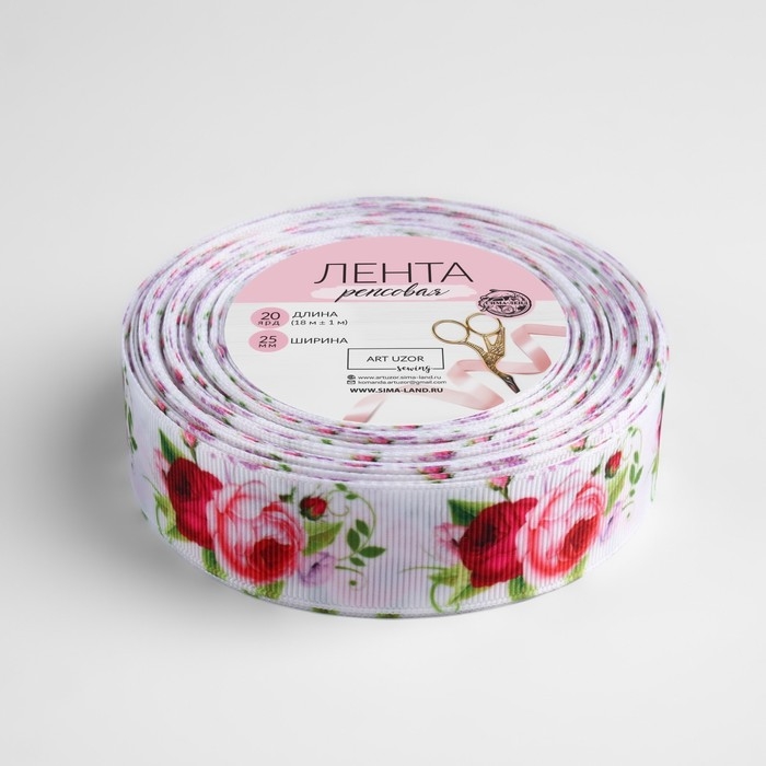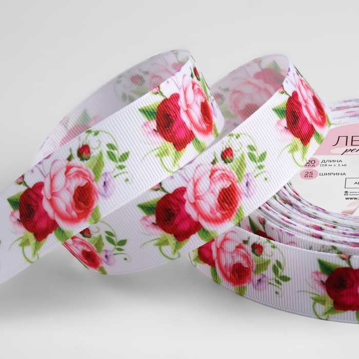 Лента репсовая «Розы», 25 мм, 18 ± 1 м, цвет белый/розовый