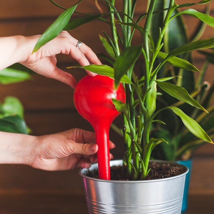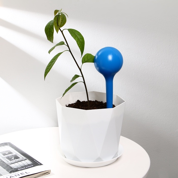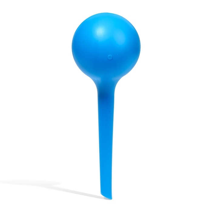 Принцип действия автополива: воздух, который находится выше уровня жидкости в колбе, расширяется в зависимости от изменения температуры окружающей среды, и выдавливает влагу в почву, поливая растение.