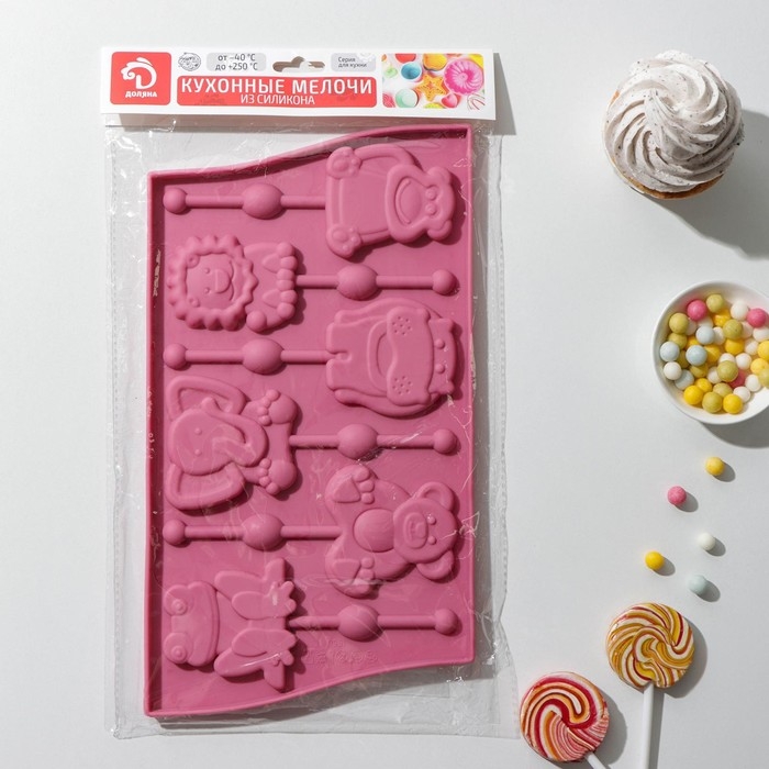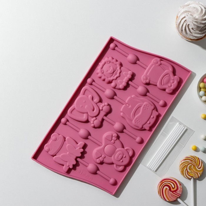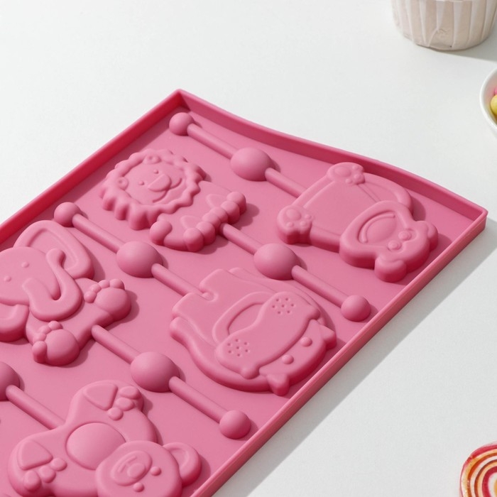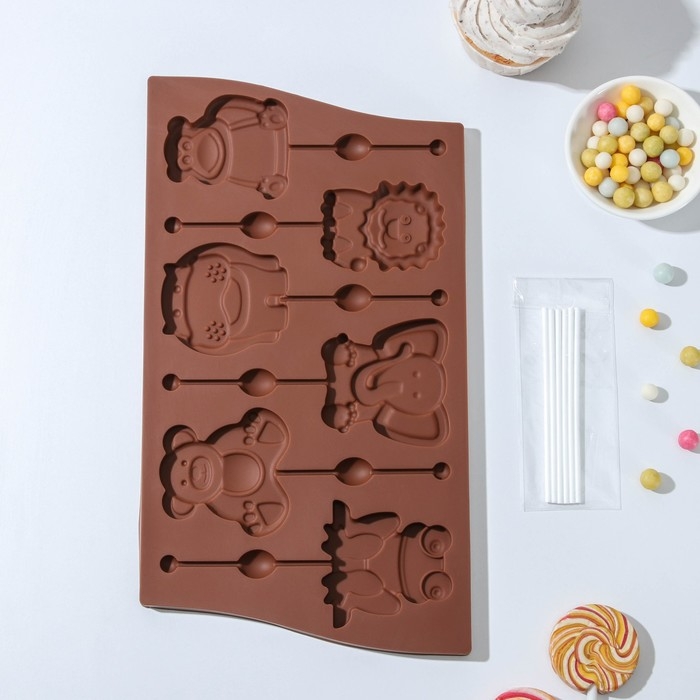 Форма для леденцов Доляна «Звери», силикон, 27,5×16,5 см, 6 ячеек (6,4×6,4), с палочками, цвет МИКС