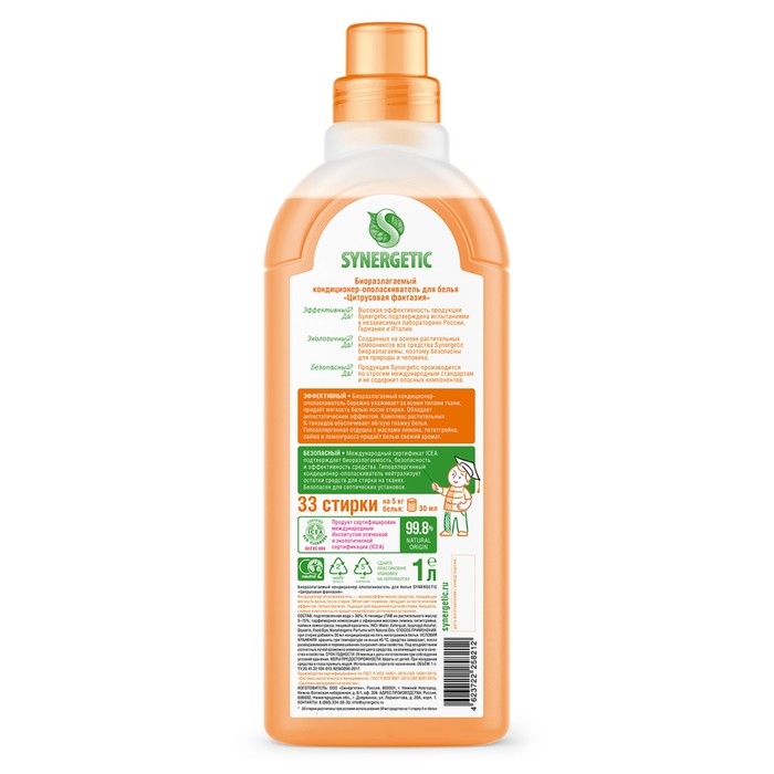 Биоразлагаемый кондиционер-ополаскиватель для белья SYNERGETIC ""Цитрусовая фантазия"" – высокоэффективное средство, бережно ухаживающее за всеми типами ткани, в том числе деликатными, и придающее особую мягкость и нежность белью после стирки.