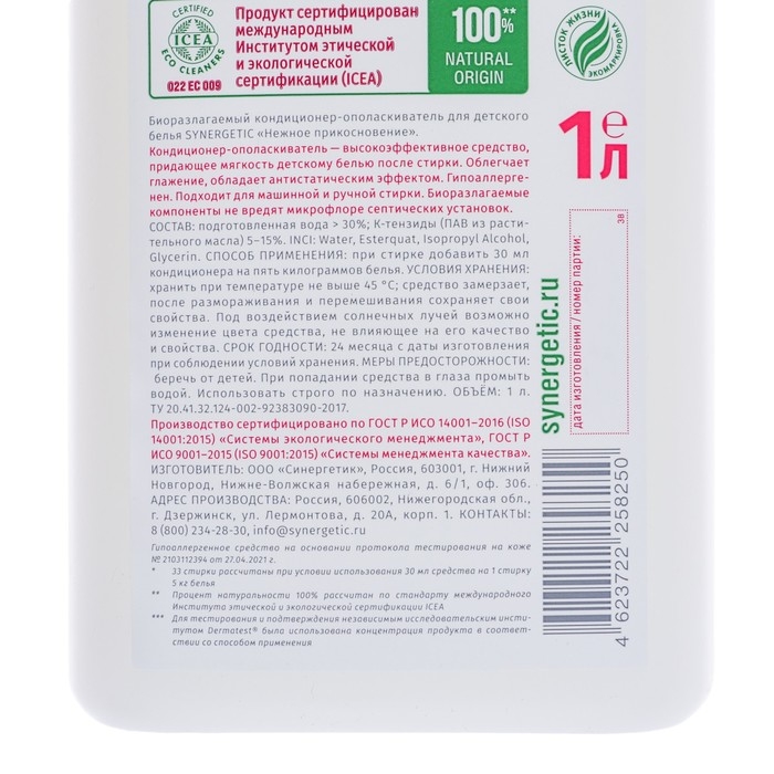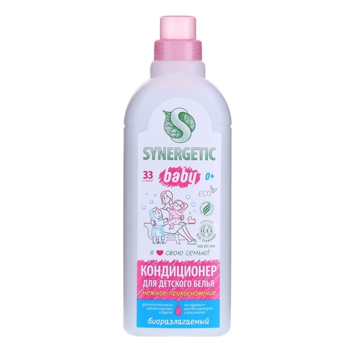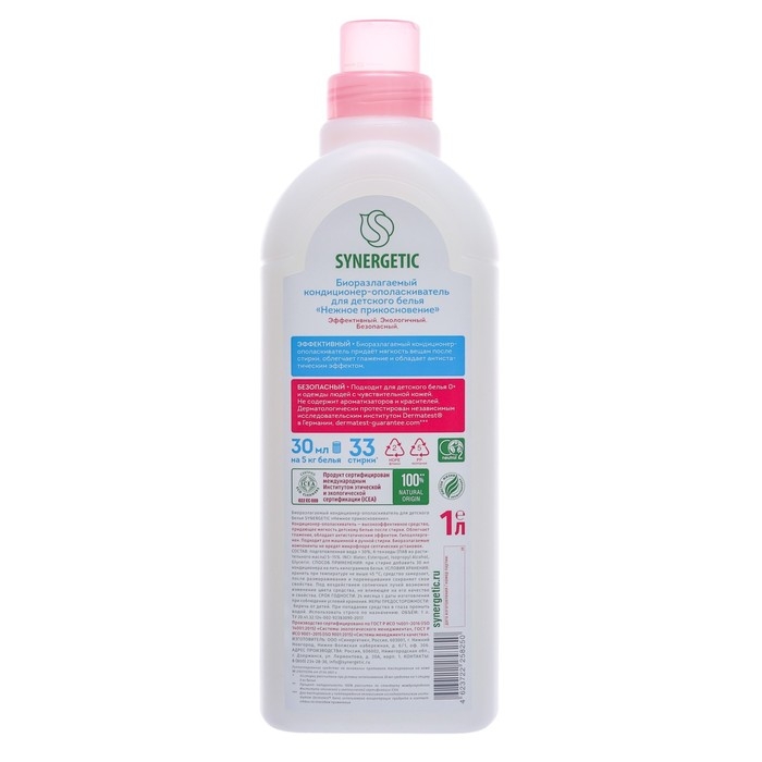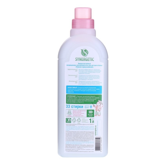 Биоразлагаемый кондиционер-ополаскиватель для детского белья SYNERGETIC "Нежное прикосновение" – высокоэффективное средство, бережно ухаживающее за всеми типами ткани, в том числе деликатными, и придающее особую мягкость и нежность белью после стирки.