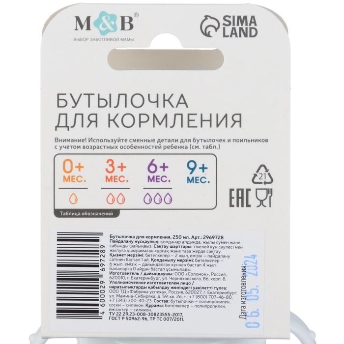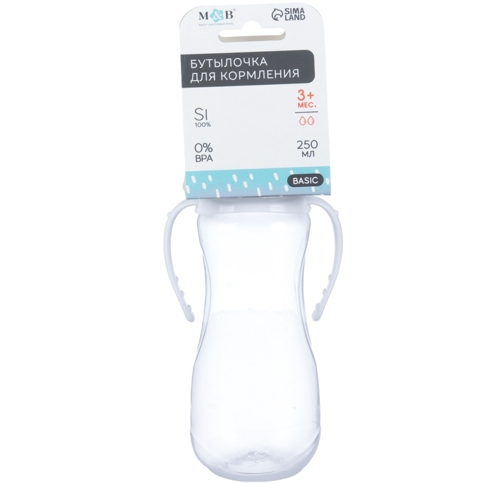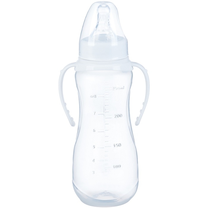 Бутылочка для кормления, классическое горло, 250 мл., от 3 мес., приталенная, с ручками, цвет белый