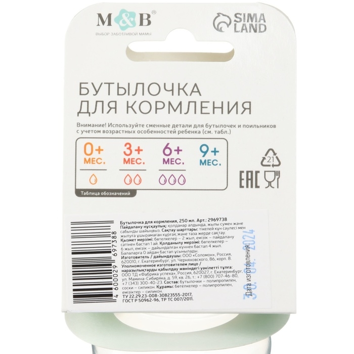 Бутылочка для кормления, классическое горло, приталенная, 250 мл., от 3 мес., цвет белый