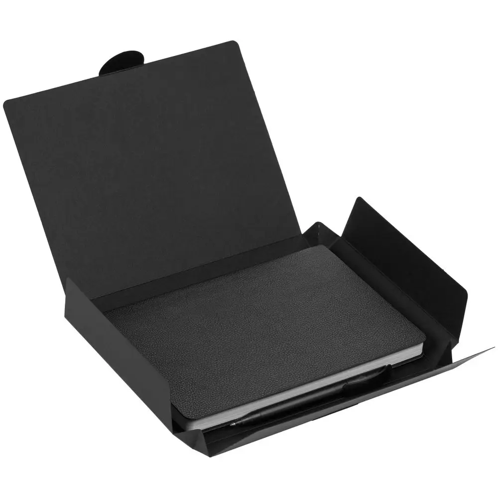 Недатированный ежедневник с гибкой обложкой из фактурного материала La Fite и металлическим шильдом на ляссе и ручка в тон, упакованные в подарочную коробку из дизайнерского картона.