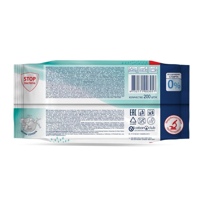 Влажные салфетки Aura Family, для всей семьи, 200 шт
