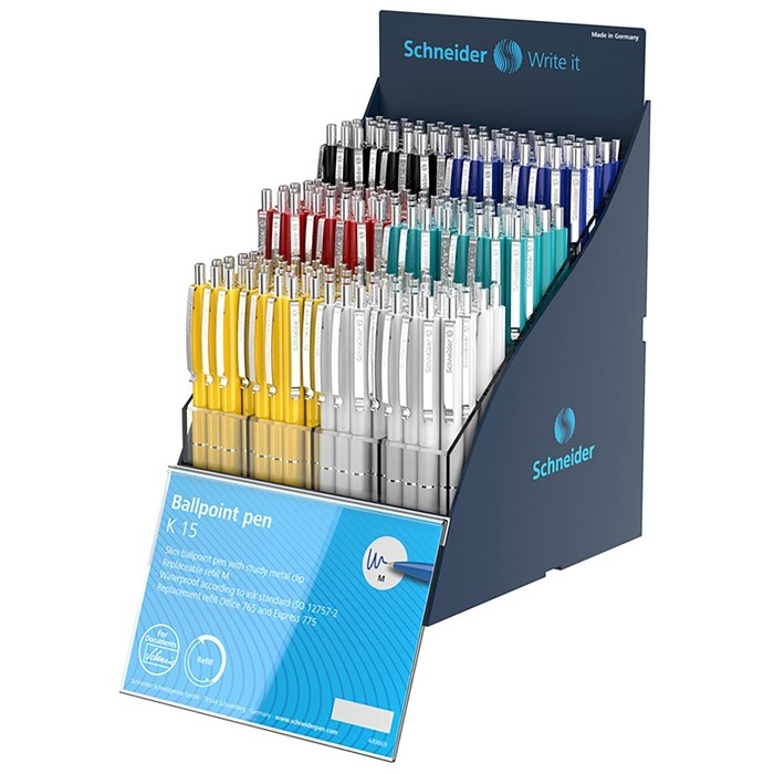 Пластиковый дисплей содержит шариковые ручки K15 в корпусе следующих цветов: синий, белый, черный, красный, бирюзовый, желтый - всего 216 штук. Автоматические шариковые ручки в узнаваемом классическом пластиковом корпусе с металлическим клипом. Длина непрерывной линии - до 2 000 метров. Быстросохнущие, свето- и водоустойчивые чернила соответствуют международному стандарту качества ISO 12757-2 и отлично подходят для заполнения и подписи документов.
