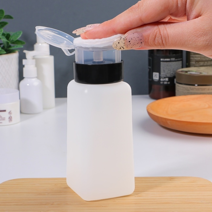 В данной баночке удобно хранить средство для снятия лака, лосьон для лица и другие косметические составы: они не выветрятся и не вытекут. Ёмкостью очень легко пользоваться: просто положите сверху ватный диск и нажмите на помпу, чтобы он пропитался содержимым. Такая система уменьшает расход материала и делает процедуру быстрее и приятнее.