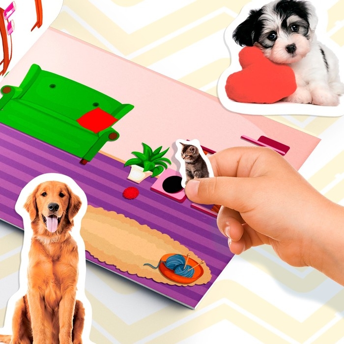 В альбоме представлено 250 наклеек с красочными изображениями собак и кошек. Яркие картинки положительно влияют на визуальное восприятие малыша, память и воображение.