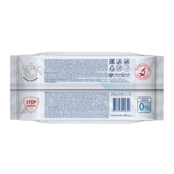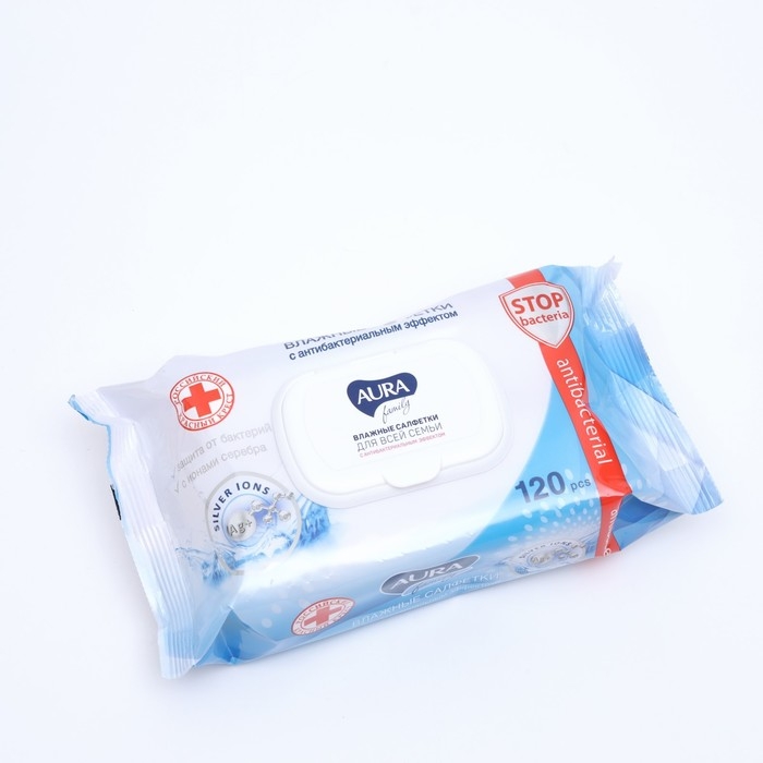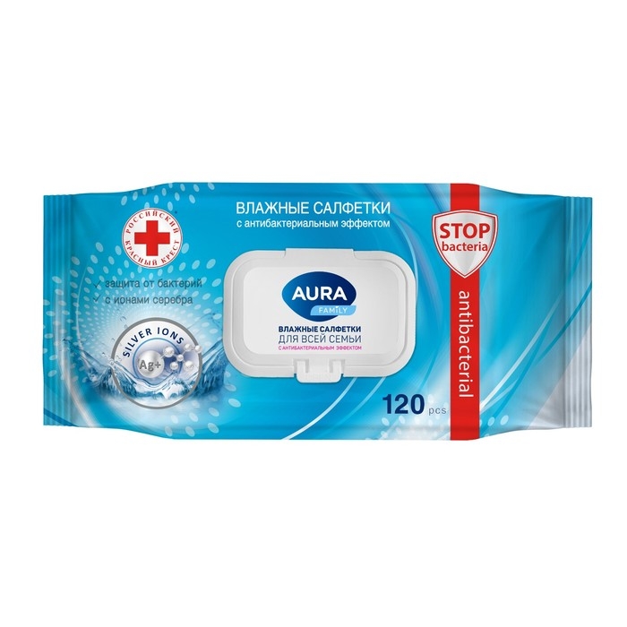 Влажные салфетки AURA FAMILY, для всей семьи, с антибактериальным эффектом 120 шт