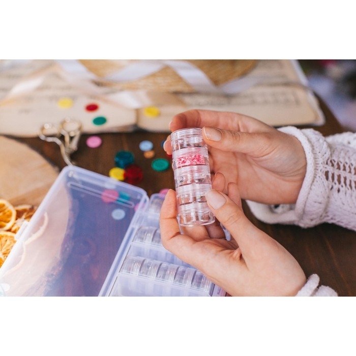 Что может быть лучше для мастерицы, чем аккуратная и организованная рабочая зона? В её создании вам поможет специальный контейнер. Он разделён на отсеки, куда вы сможете разложить отдельные детали или аксессуары. С ним вы не перепутаете и не рассыплете бисер, а прозрачный пластик, из которого изготовлен контейнер, позволит с лёгкостью найти нужный вам цвет и размер бусин.