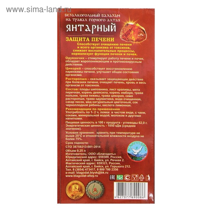 Бальзам безалкогольный "Янтарный" защита печени, 250 мл