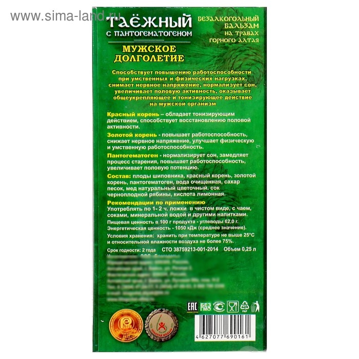 Бальзам безалкогольный «Таёжный» с пантогематогеном, мужское долголетие, 250 мл