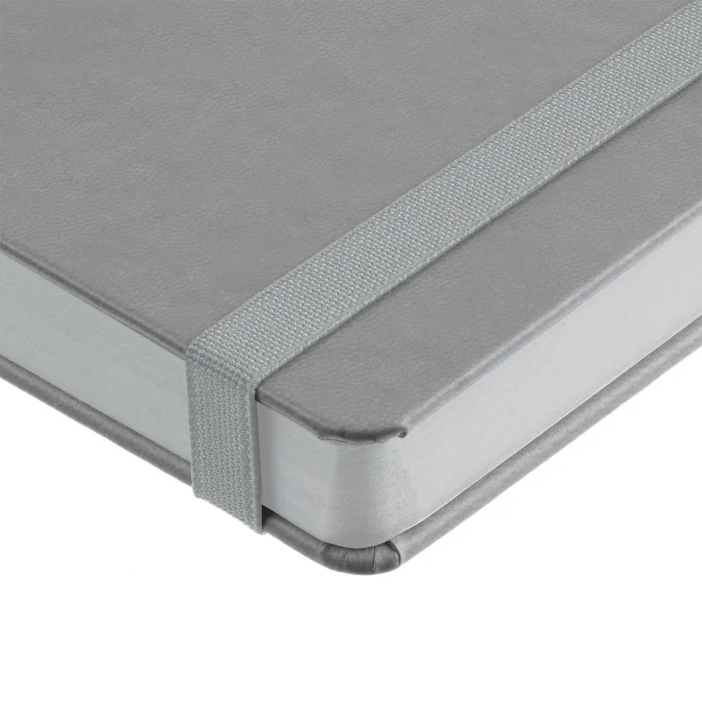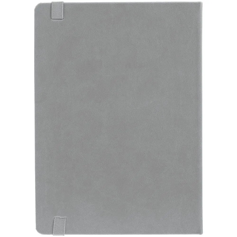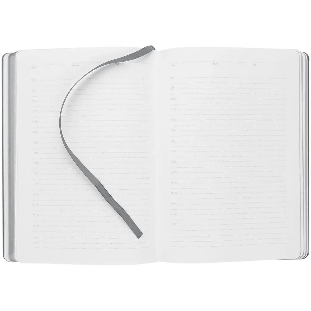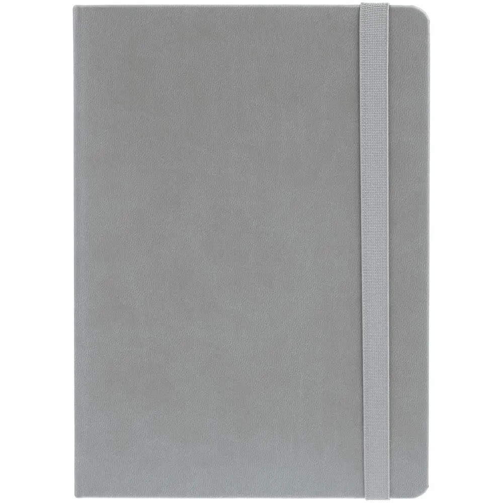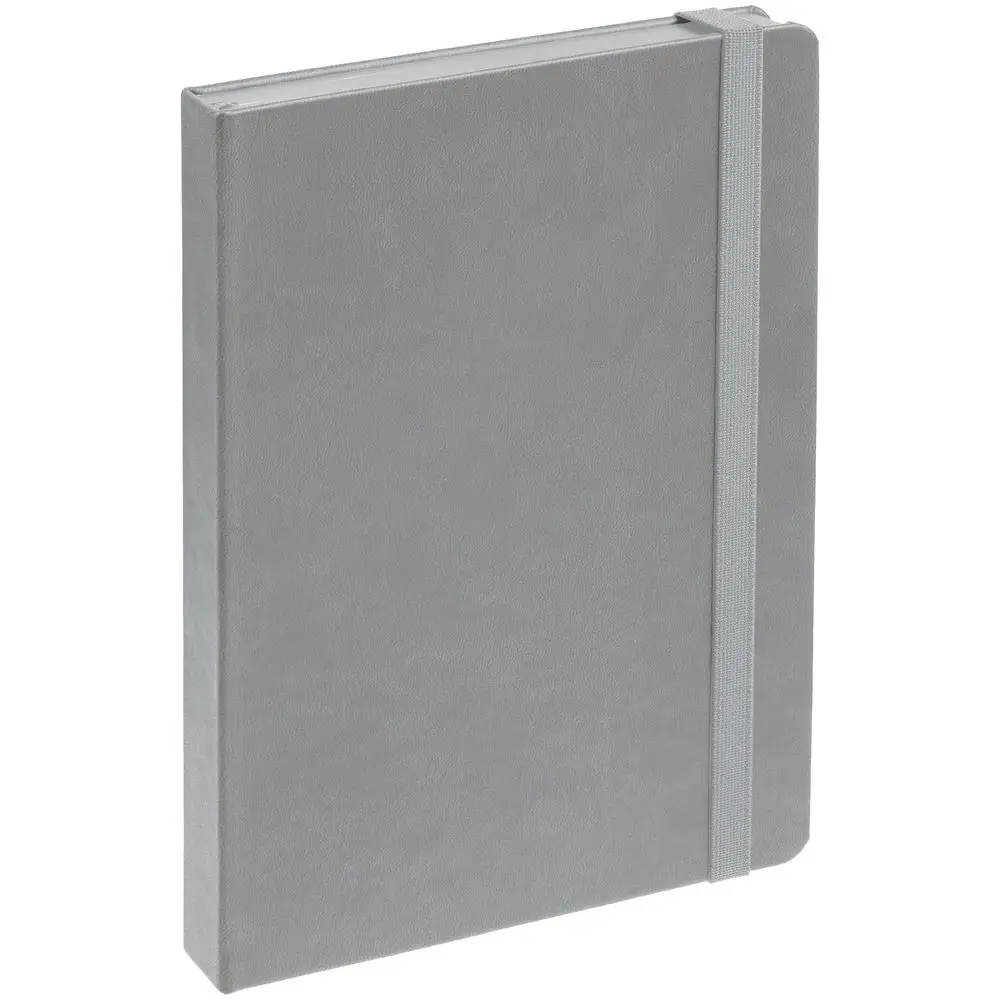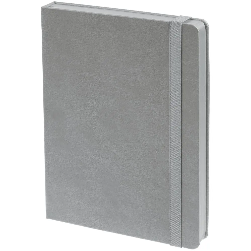 Ежедневник с твердой обложкой, выполнен из материала Latte, серый СС, обрез серого цвета, дополнен резинкой и ляссе серого цвета.