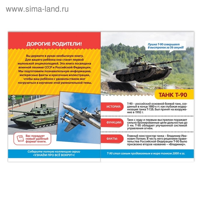 Ваш малыш узнает много важных исторических событий о военной технике, удивительных фактов о динозаврах, функциональных особенностей танков и самолётов, познакомится с необычными повадками собак, откроет тайны космического мира.