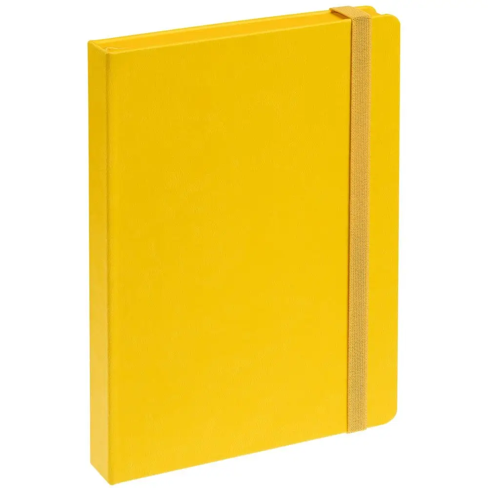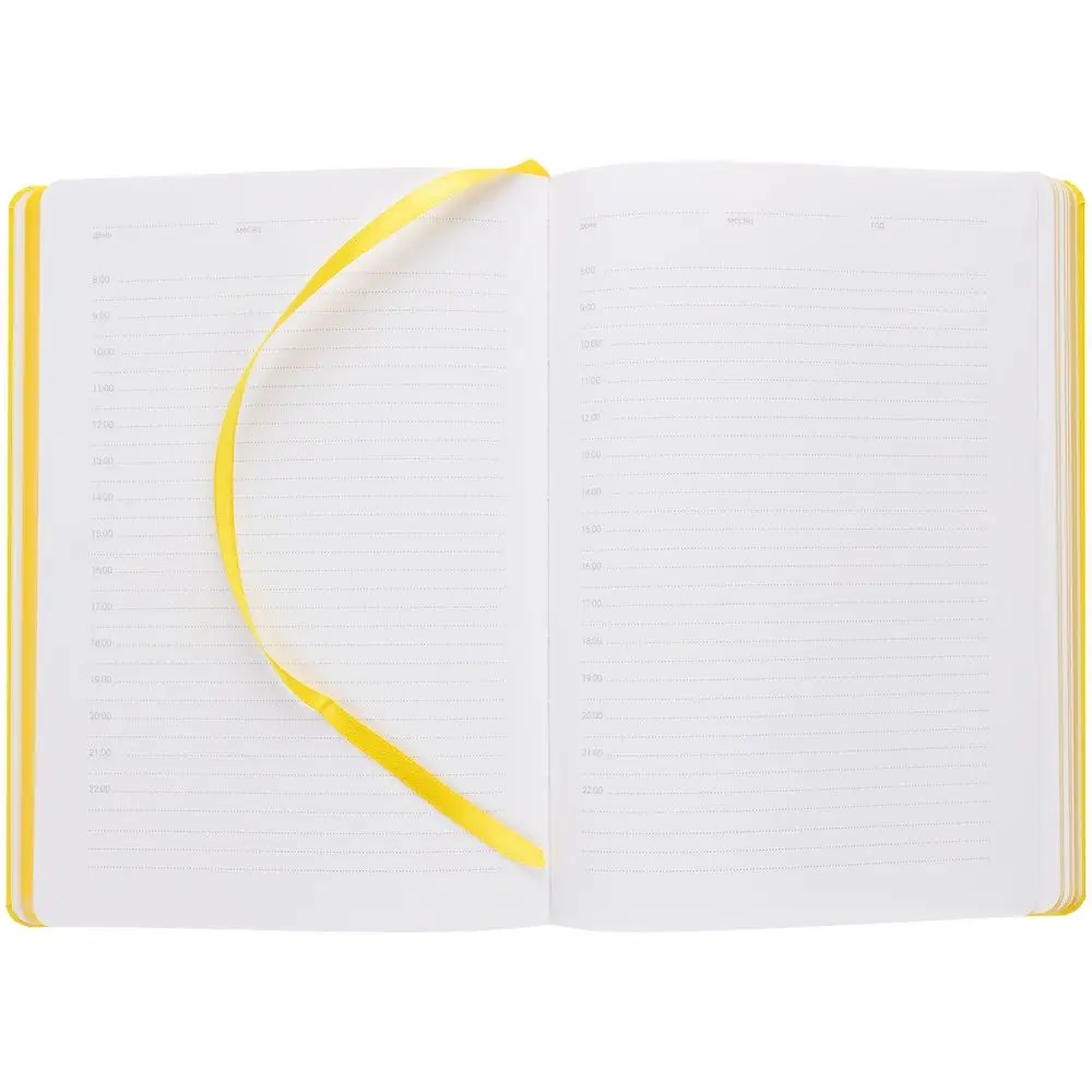 Ежедневник с твердой обложкой, выполнен из материала Latte, желтый КК, обрез зеленого цвета, дополнен резинкой и ляссе желтого цвета.