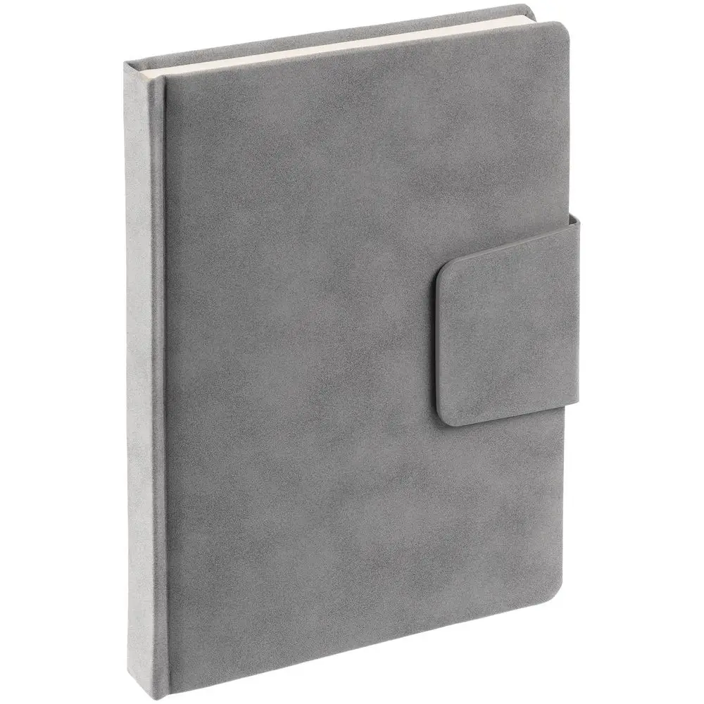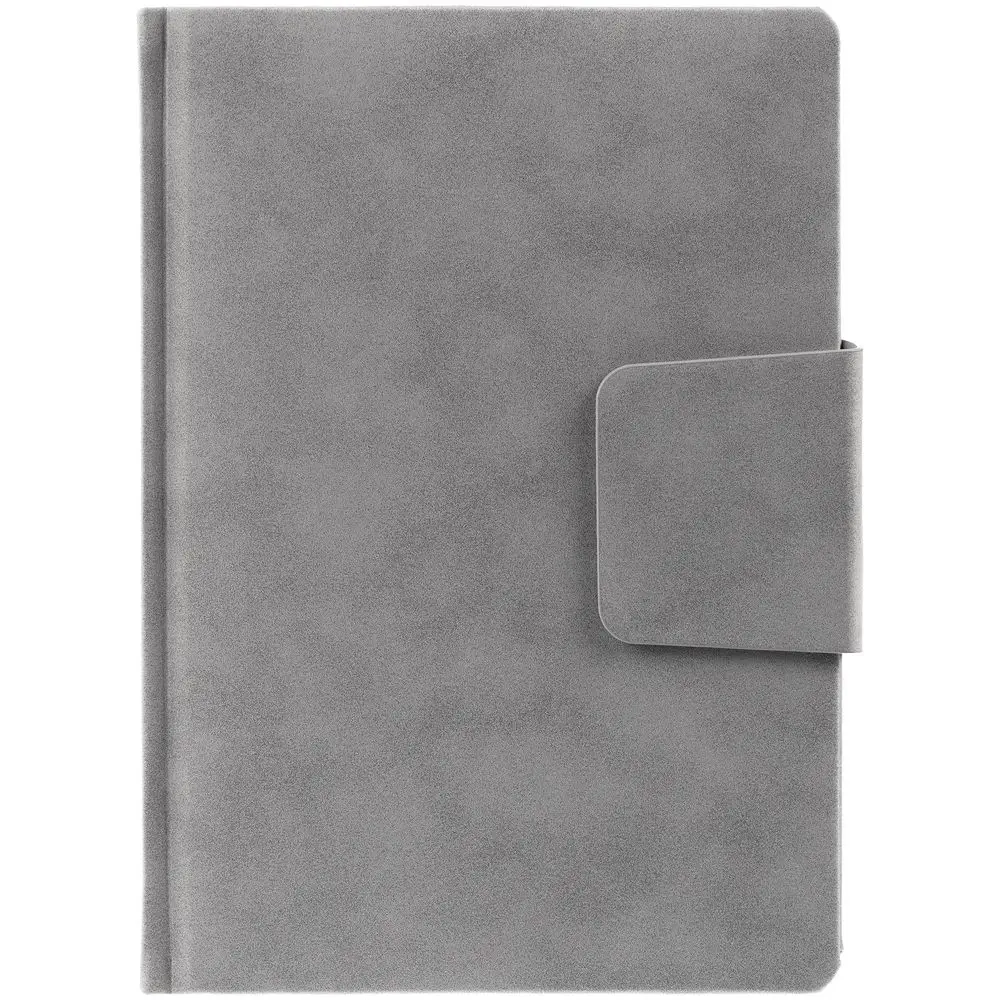 Ежедневник с твердой обложкой c поролоном, выполнен из материала Nubuck, серый СС, дополнен капталом и ляссе серого цвета. Застежка — хлястик на магните.